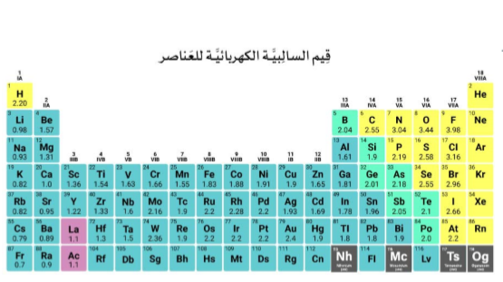 السالِبية الكهربائية . ✓ هو / هي قدرةُ الذَّرَّةِ على جذب الإلكترونات في رابطة كيميائية.