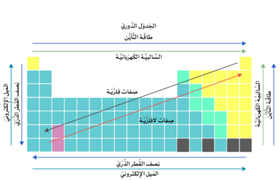 بالانتقال مِنَ اليَسار إلى اليمين عَبر دَورة ما فإِن أَنصاف الأقطار الذرِية تقل والسالبية الكهربائية تزداد ✔️