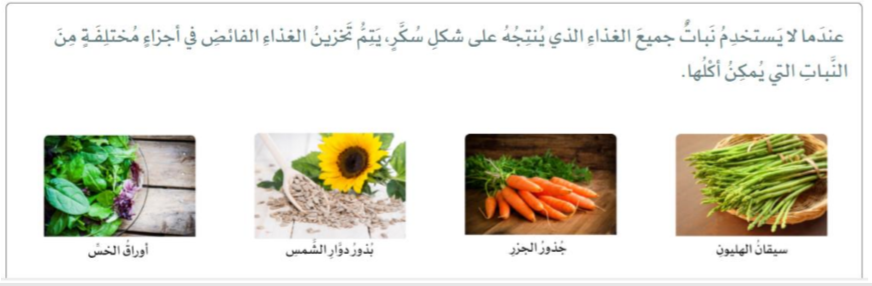 يتم تخزين الغذاءِ المُتبقي في أجزاءٍ مُختلِفَةٍ مِنَ النَّبَاتِ. ✔️