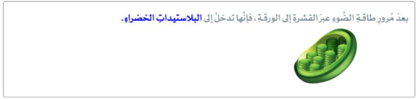 بعد مُرورِ طاقةِ الضَّوءِ عبر القشرة إلى الورقة فإنَّها تدخل إلى البلاستيدات الخضراء ✔️